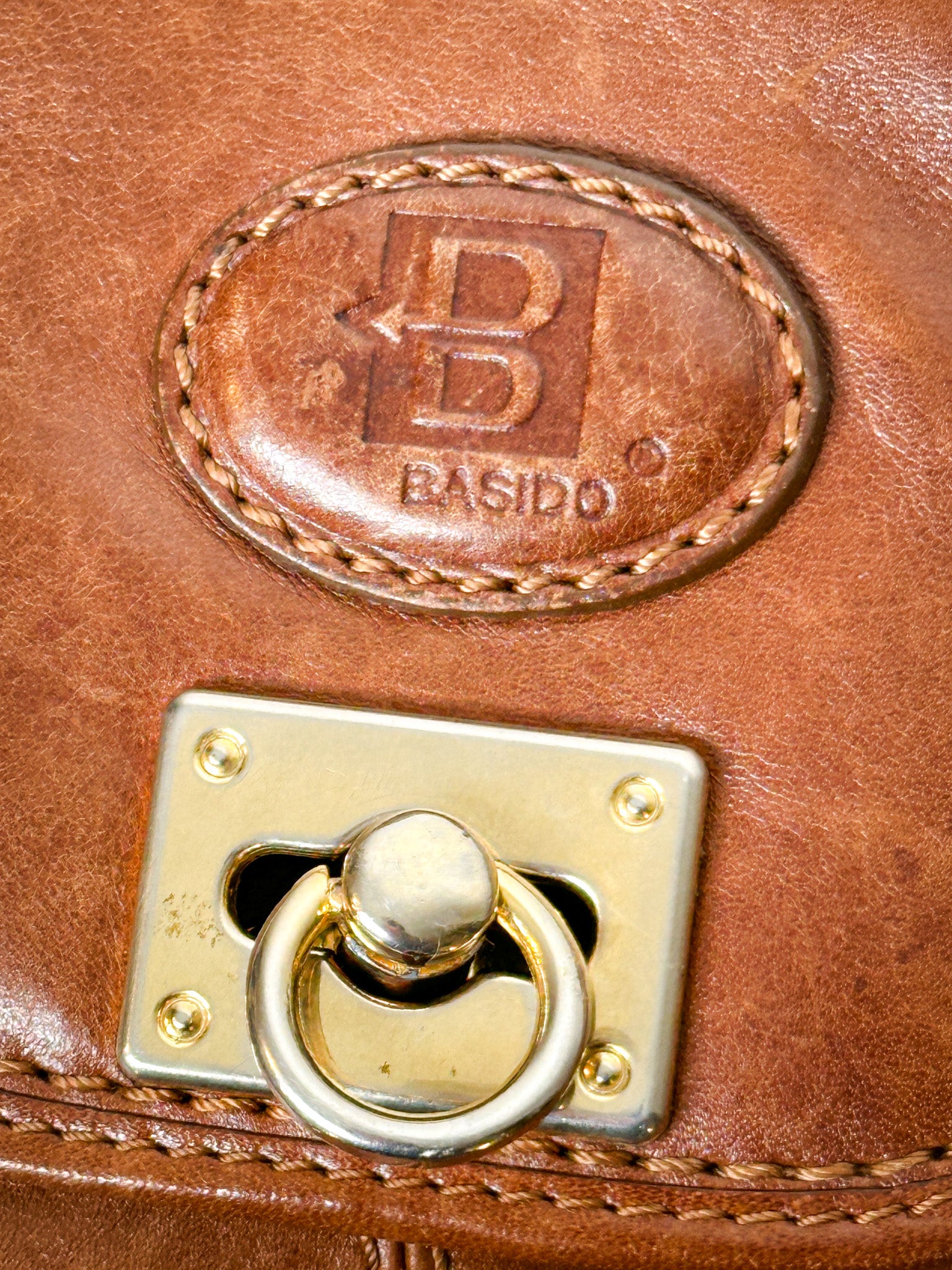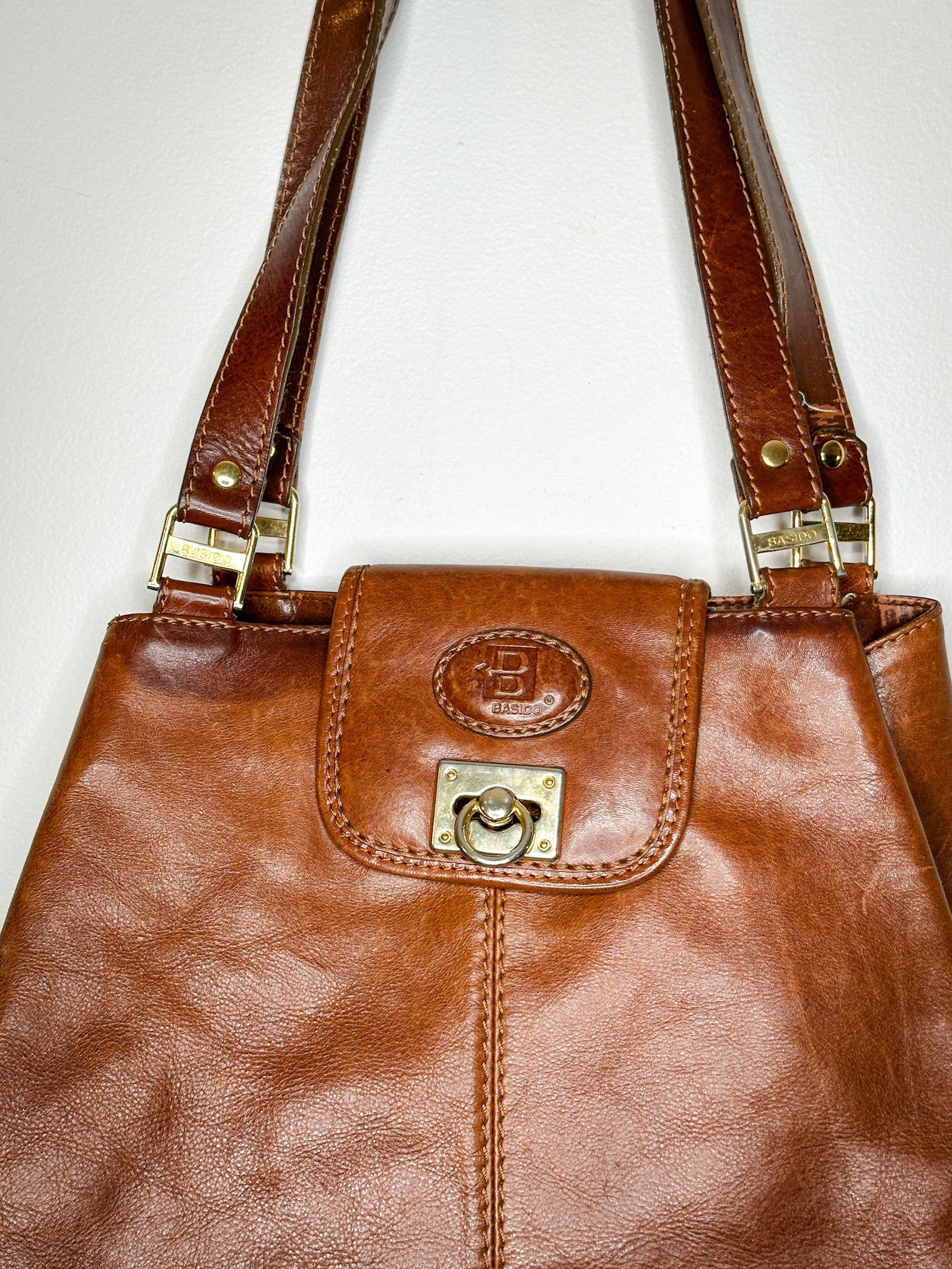 Vintage Basido Italian leather brown shoulder bag. Bag is a wonderful leather bag is clean inside with a metal clasp closure. Bag has some discolouration on the handles from everyday wear as well as some missing colour on the gold clasp. Otherwise in very good vintage condition.
