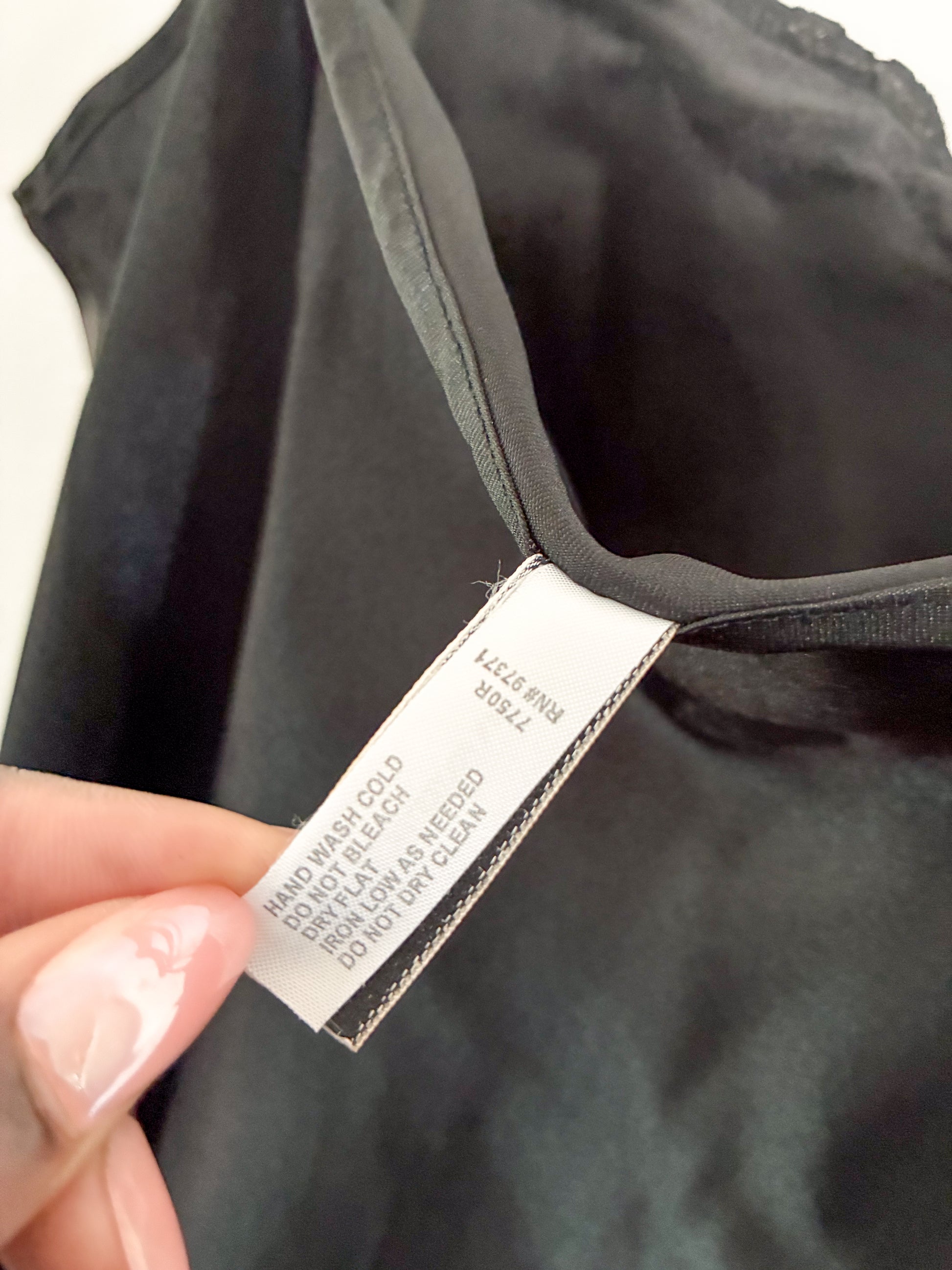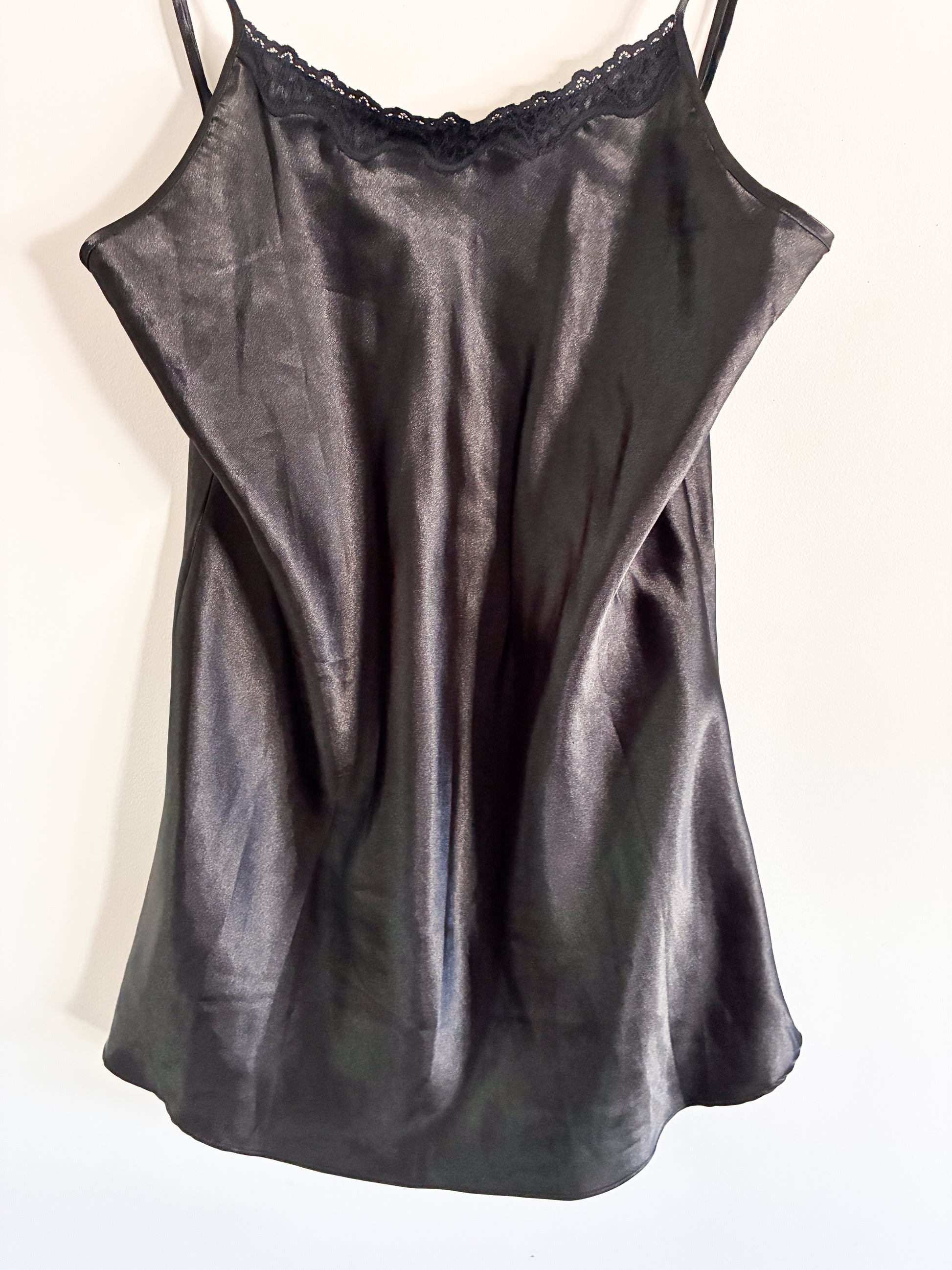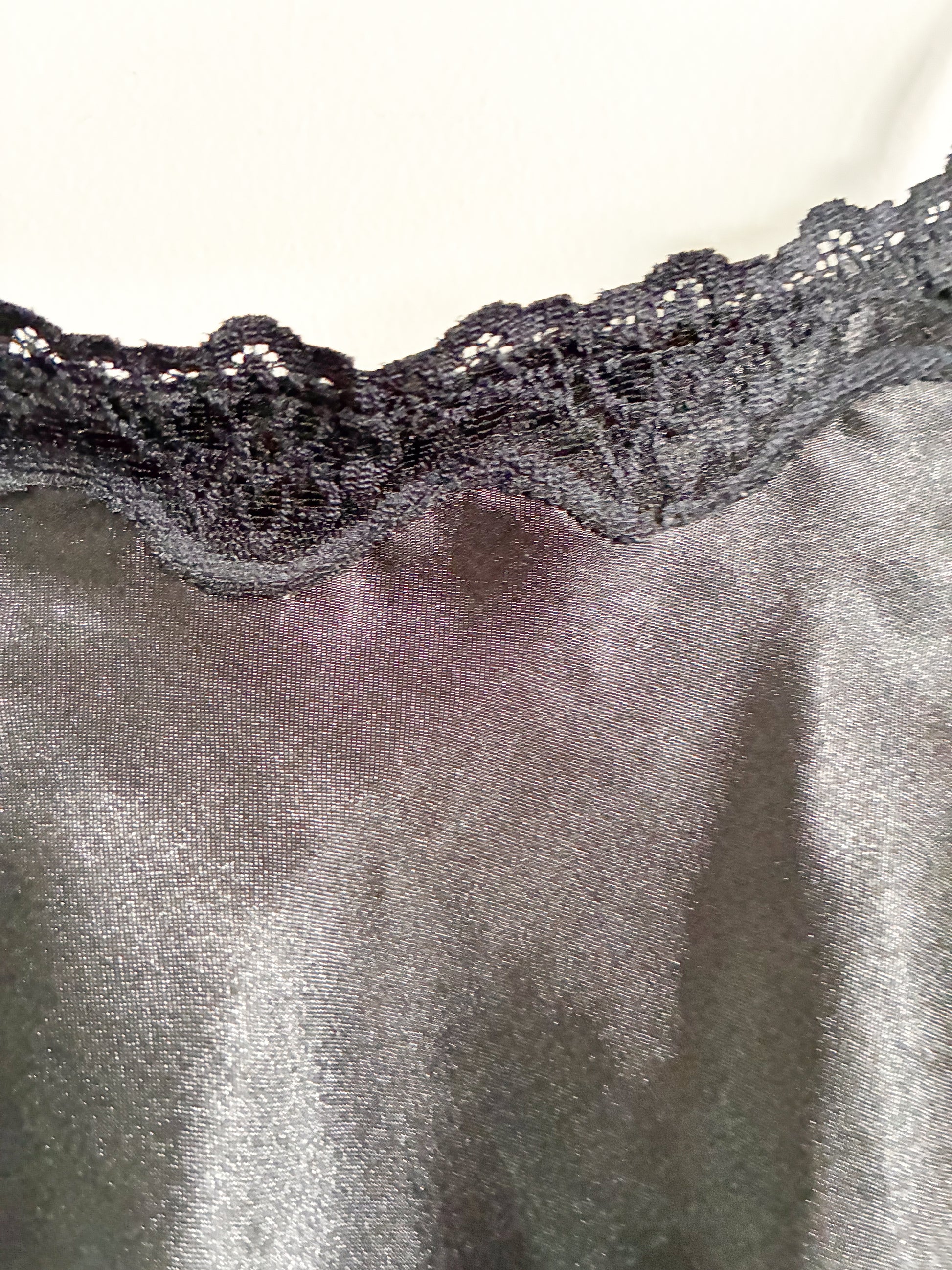 Vintage Donna Loren Gold Label black lingerie piece with lace detailing along the bust and thin adjustable straps. Lightweight with a smooth, comfortable feel.