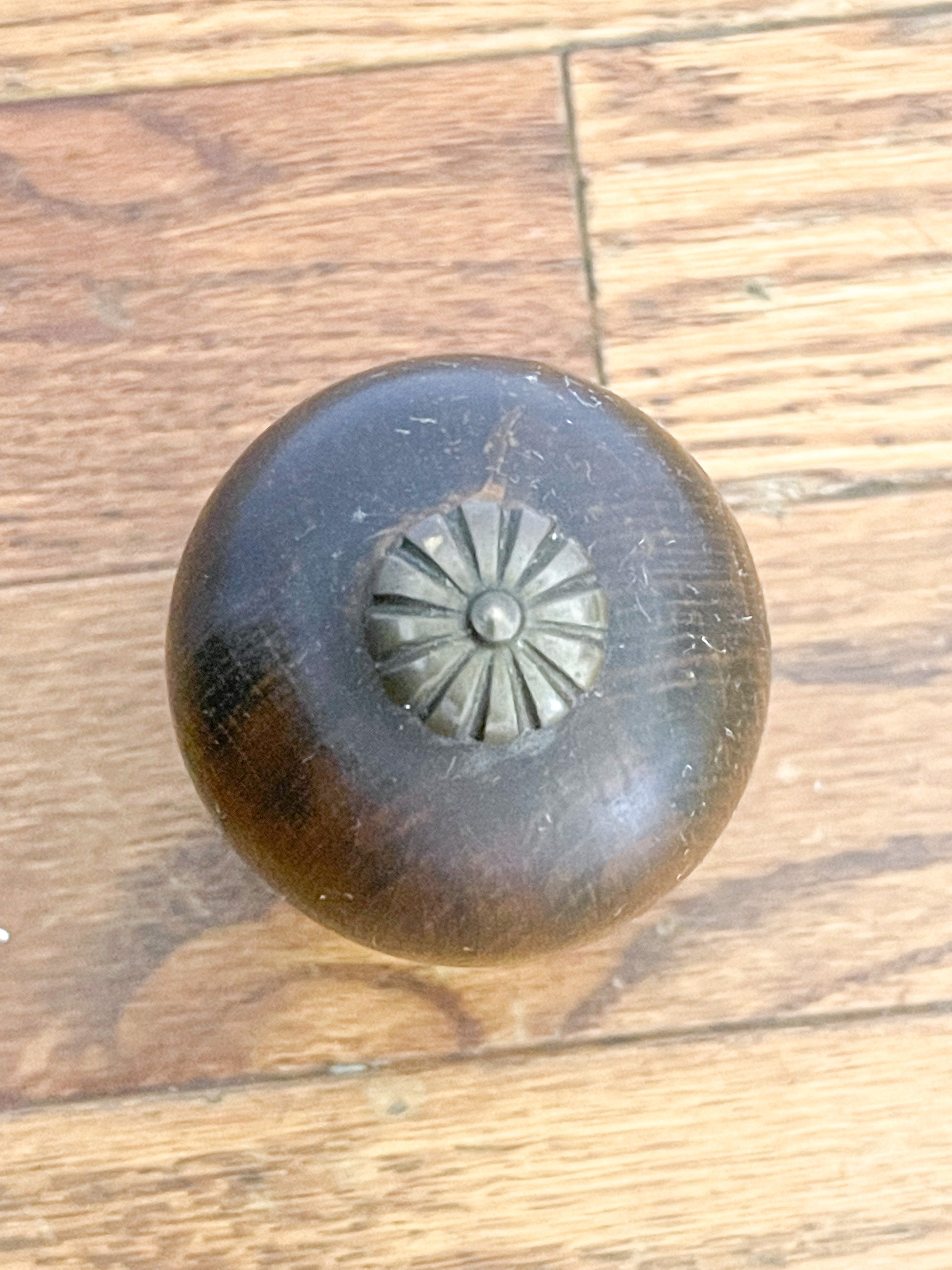 Vintage emerald green glass decanter with a decorative carved round wooden lid.