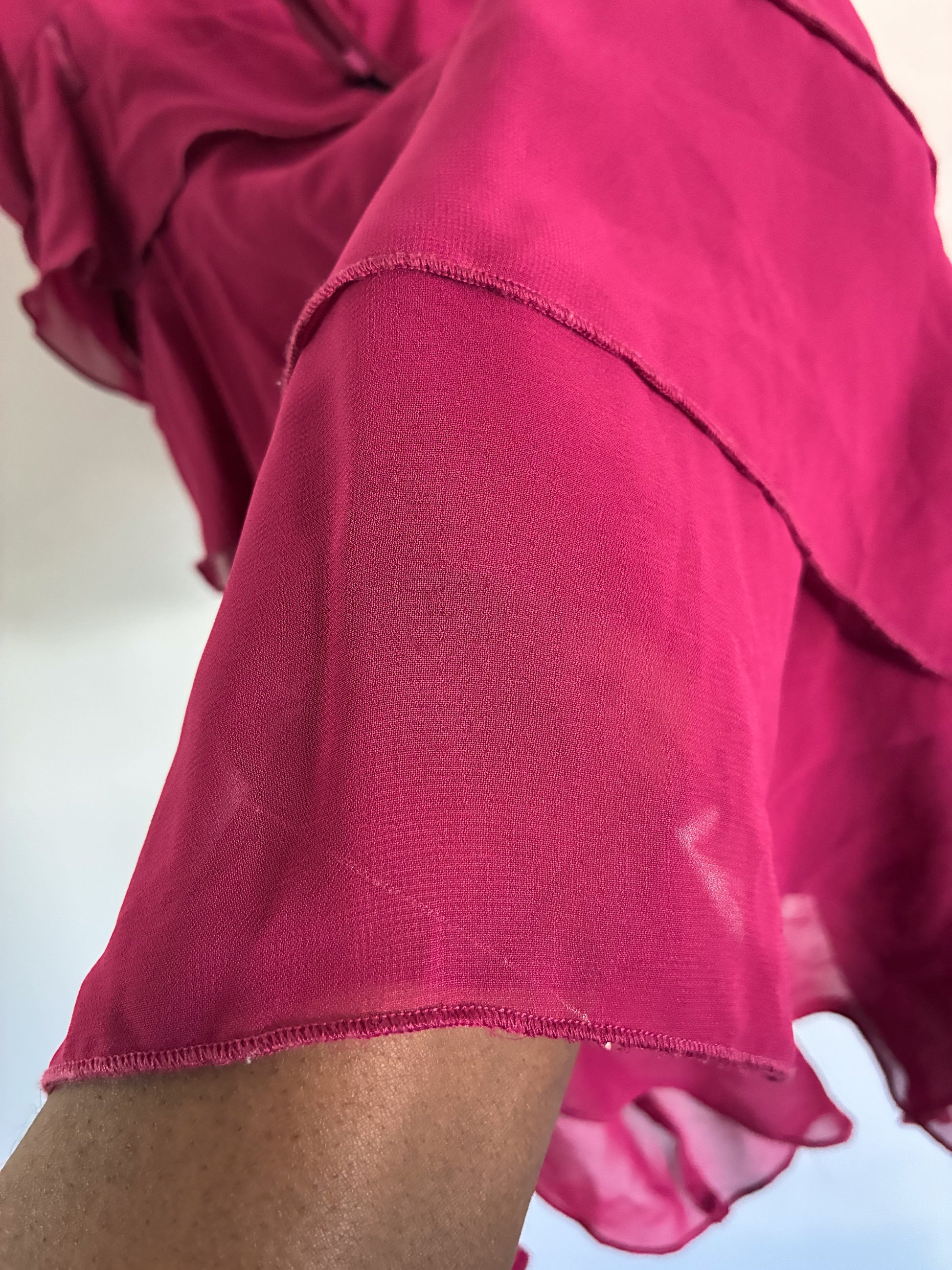 Vintage La Vie En Rose ruffled sleepwear top in a bright pink colour. Features soft ruffle detailing and four buttons at the back. The original sash is missing, but it does not take away from the overall look of the piece.