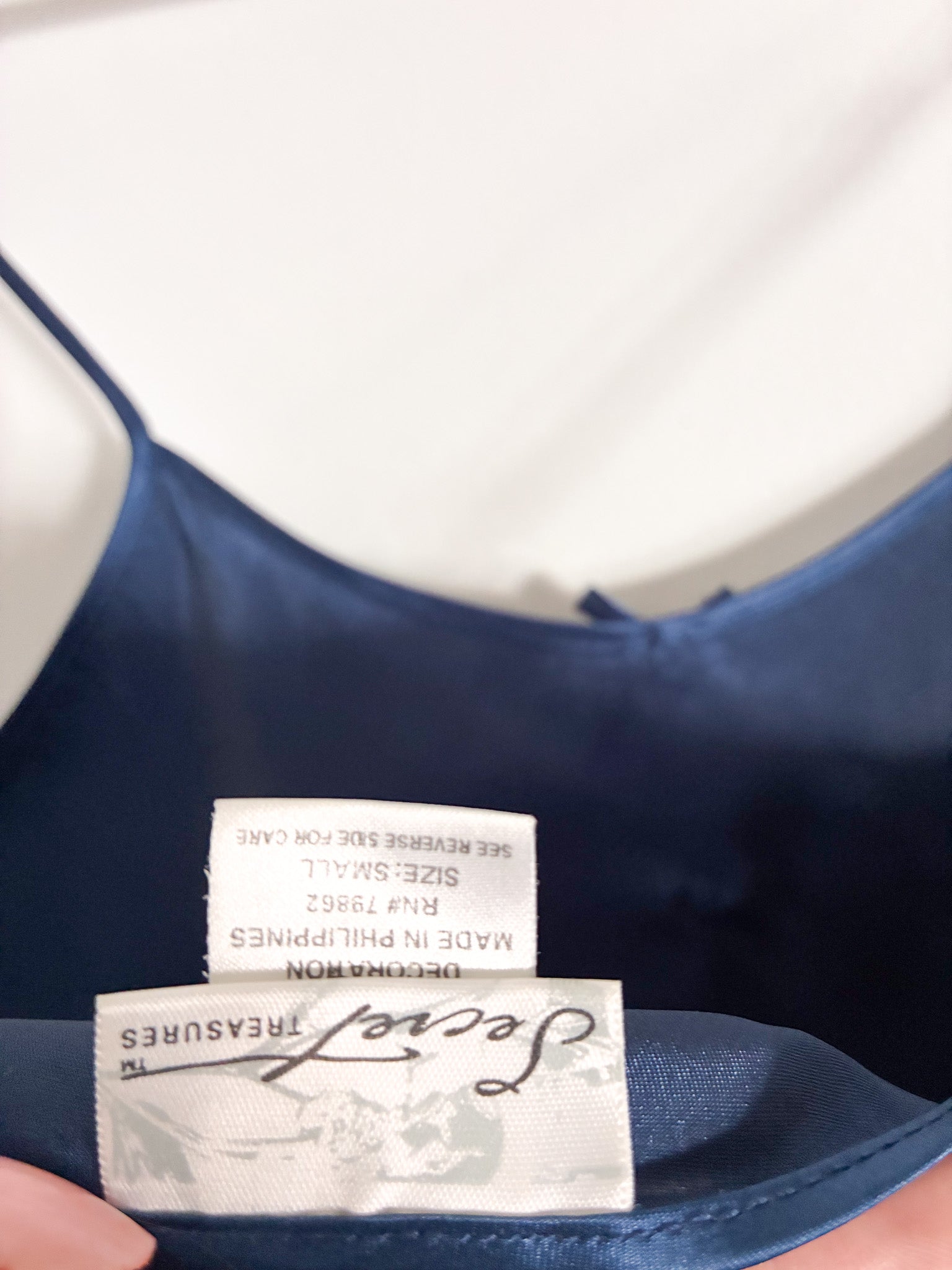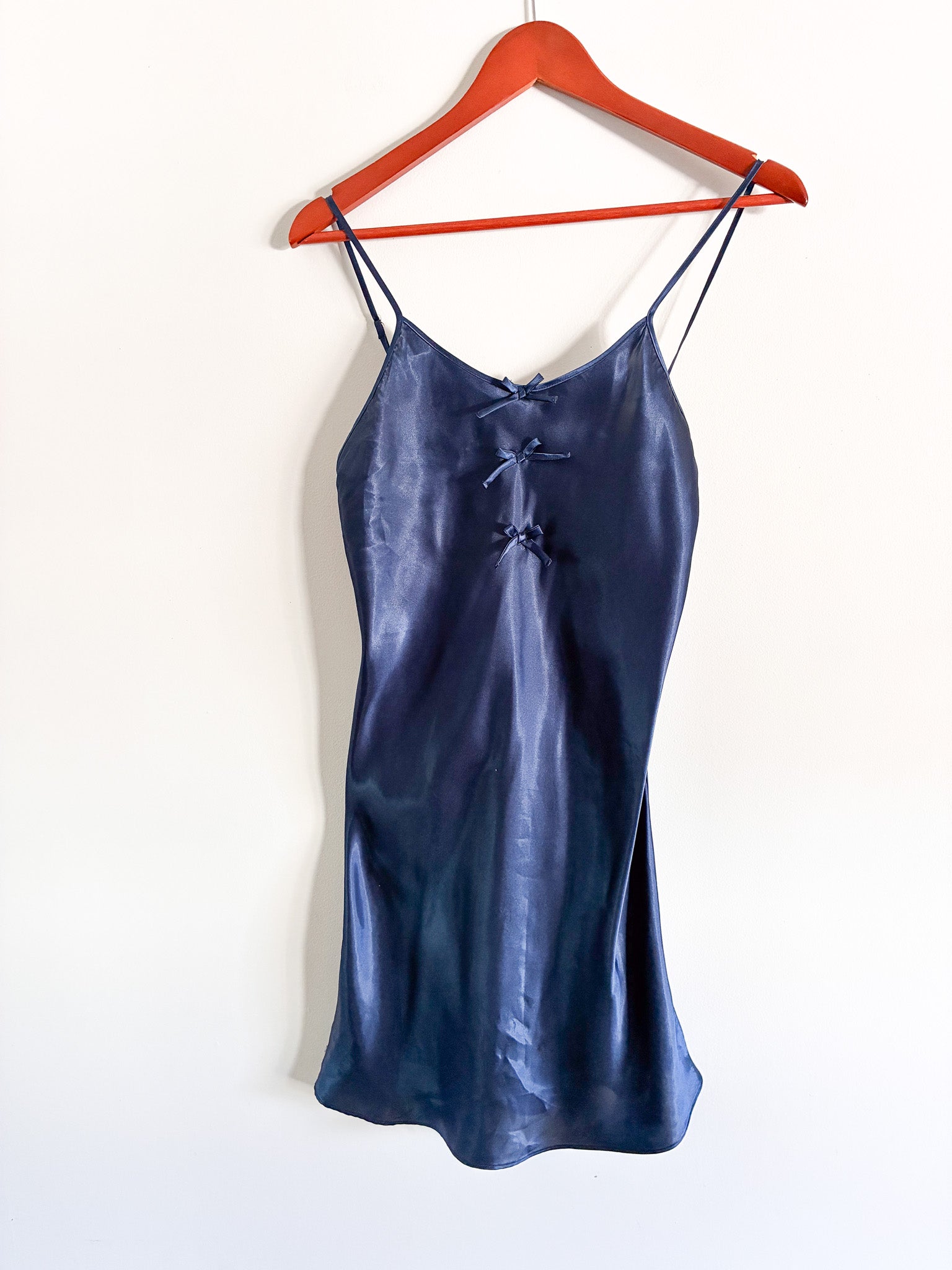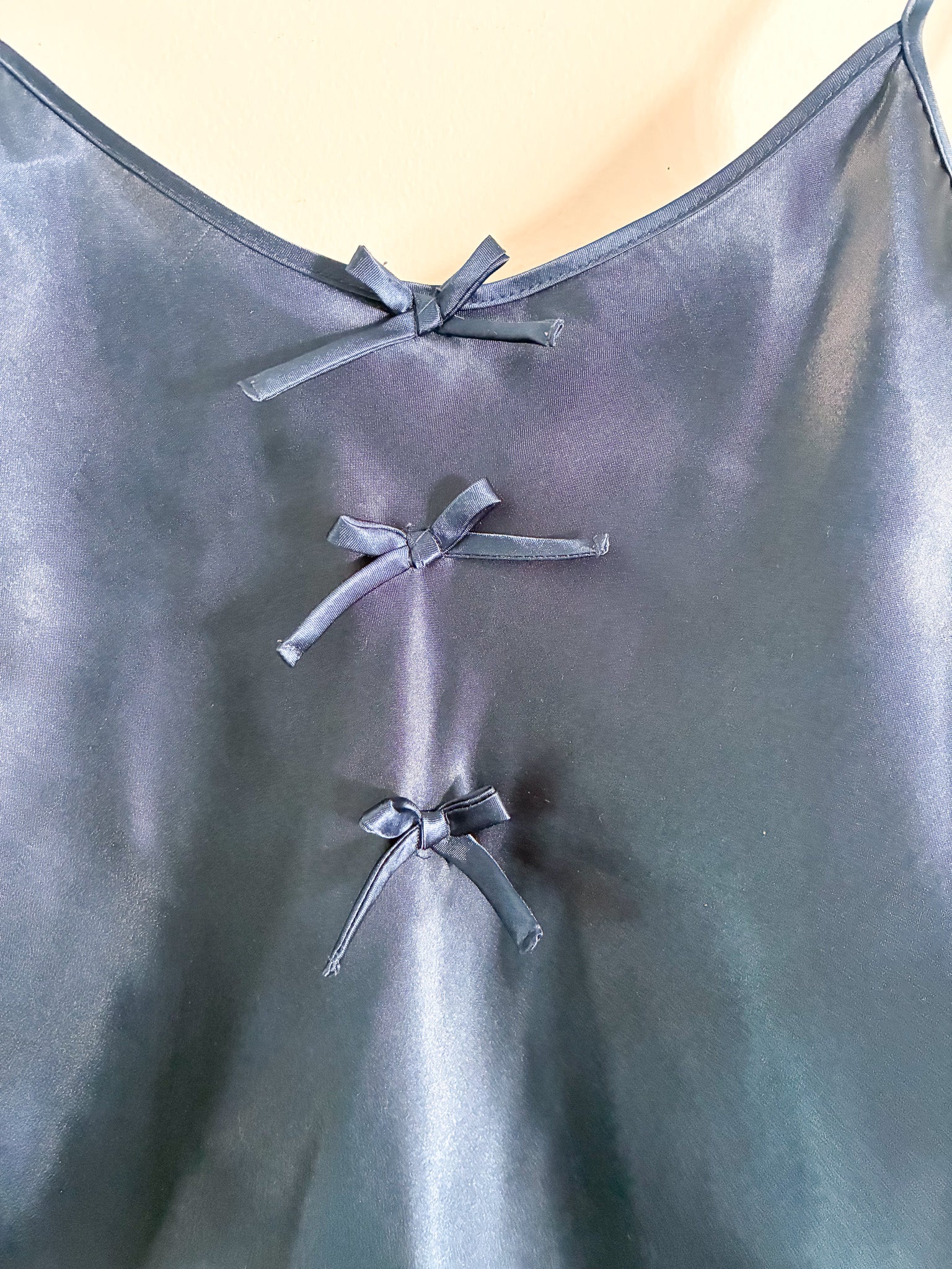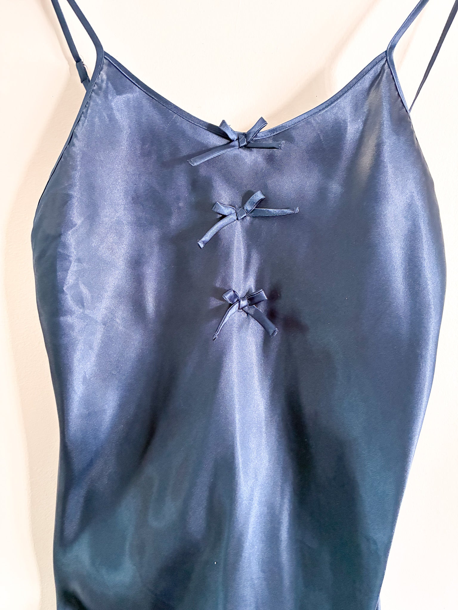 Beautiful vintage Secret Treasures negligee featuring delicate adjustable spaghetti straps and three decorative bows on the front for a soft, feminine look. Made from smooth 100% polyester fabric, this vintage lingerie piece is lightweight, comfortable, and perfect for sleepwear, loungewear, or to dress up and wear. World's your oyster.